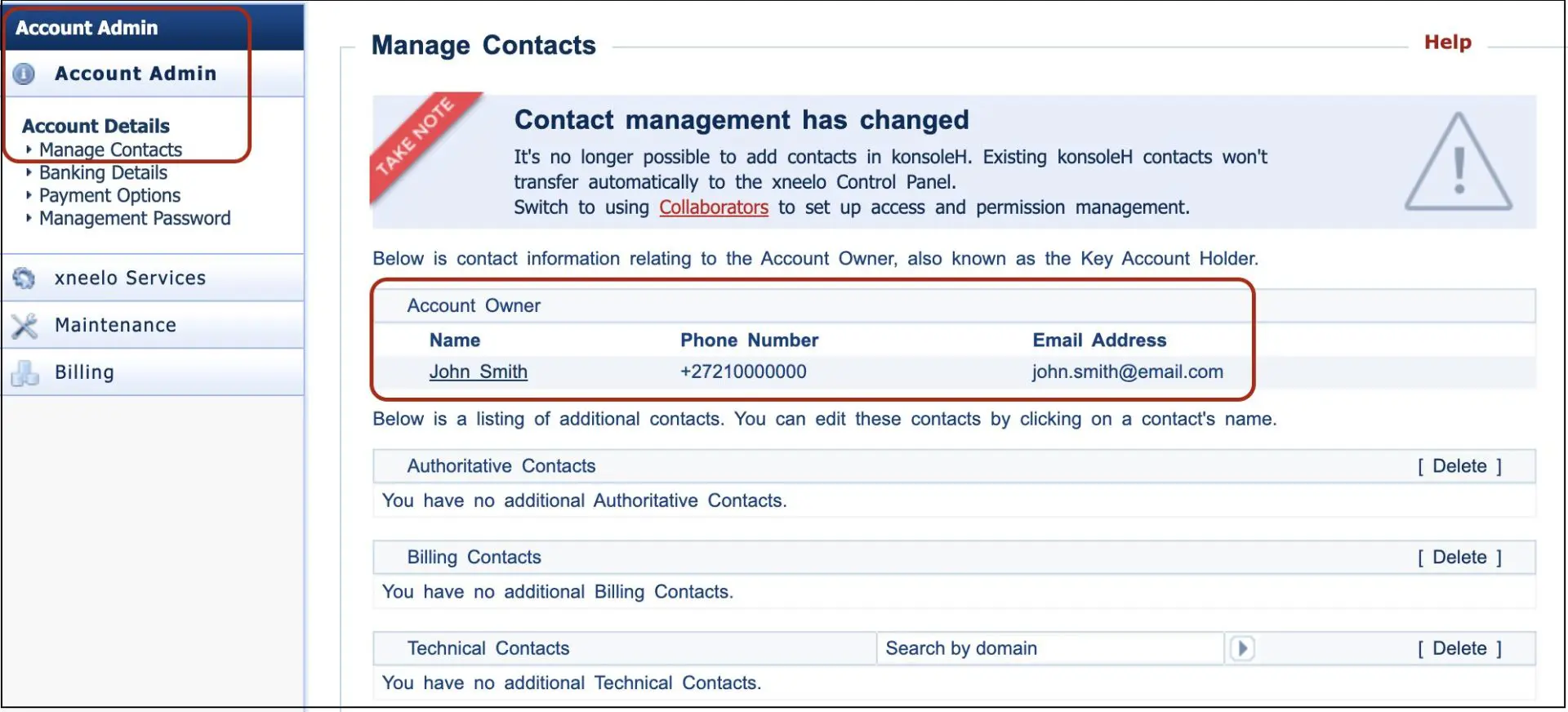 It’s no longer possible to add Authorised contacts in konsoleH. Existing konsoleH contacts won’t transfer automatically to the xneelo Control Panel. Switch to using Collaborators to set up access and permission management. |