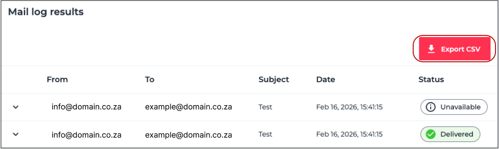 The Mail Logs report provides delivery reports on mail sent to and from email addresses linked to your domain. These logs are kept for 60 days.