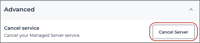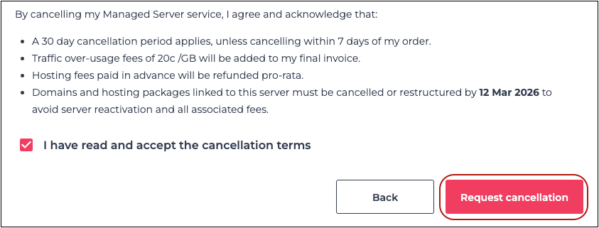 Please ensure that domain names, content and any services related to your server (i.e. databases) have been transferred, copied or removed from our network before cancellation takes place.