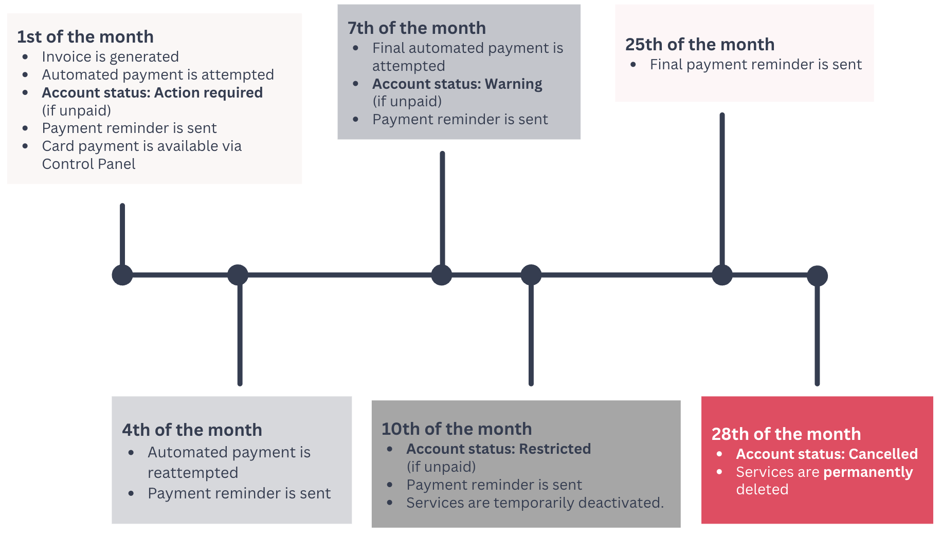 A scheduled automated payment attempt takes place on the 1st of each month. If unsuccessful we will retry on the 4th and 7th. If these attempts remain unsuccessful, your invoice and account status will be updated and appropriate action will be taken.