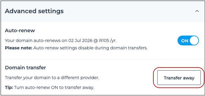 - Transfer away for country code top-level domains (e.g., co.za or .org.za)