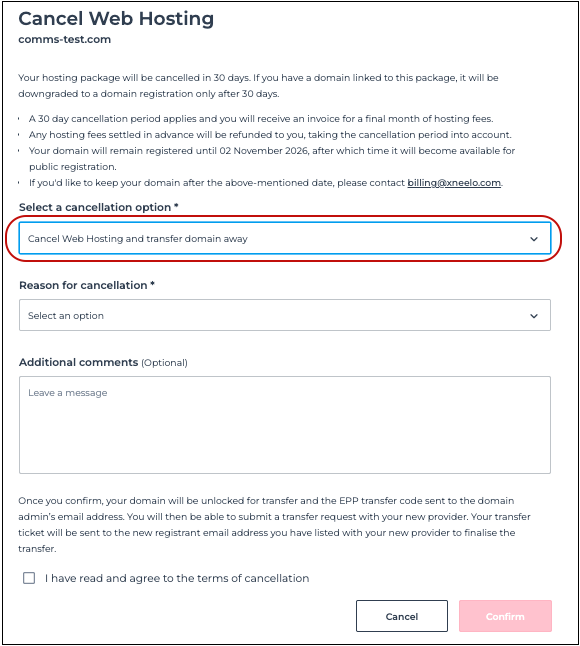 - Select Cancel Web Hosting and transfer domain away from the cancellation option drop-down list.