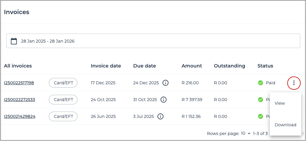 - You can download your invoice by selecting the 3 dots menu to the right of the invoice and selecting Download.