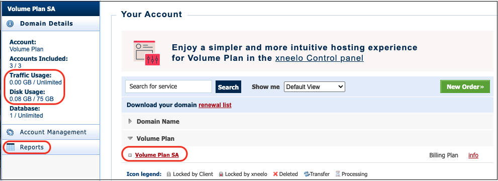 Reports on traffic and disk usage of the Volume Plan are available in the konsoleH control panel. This tool allows you to drill down to the individual files and folders per domain to assist in managing your usage. The Notifications tool allows you to customise your usage reports.