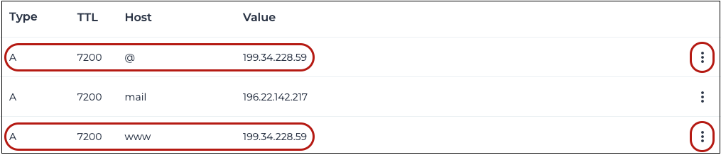 6Select the 3 dots in line with www record (A record) and then click on Edit.